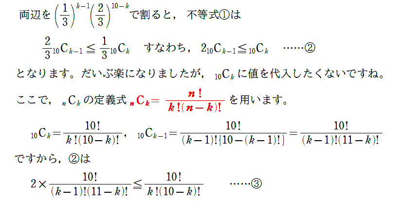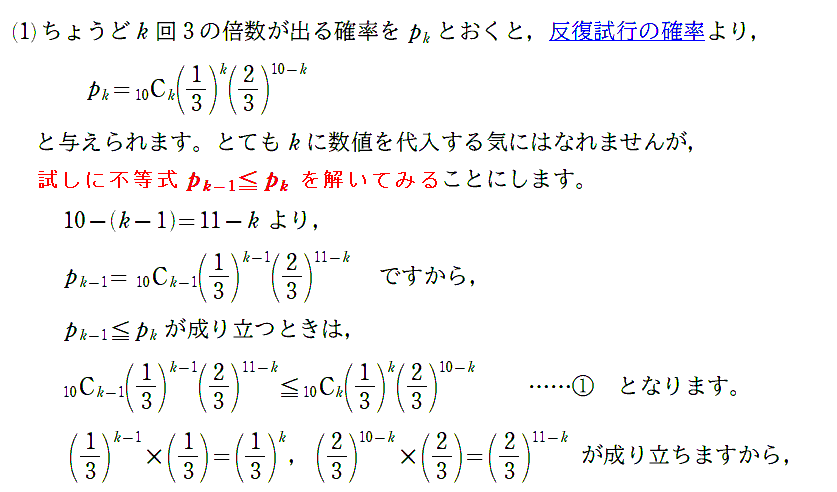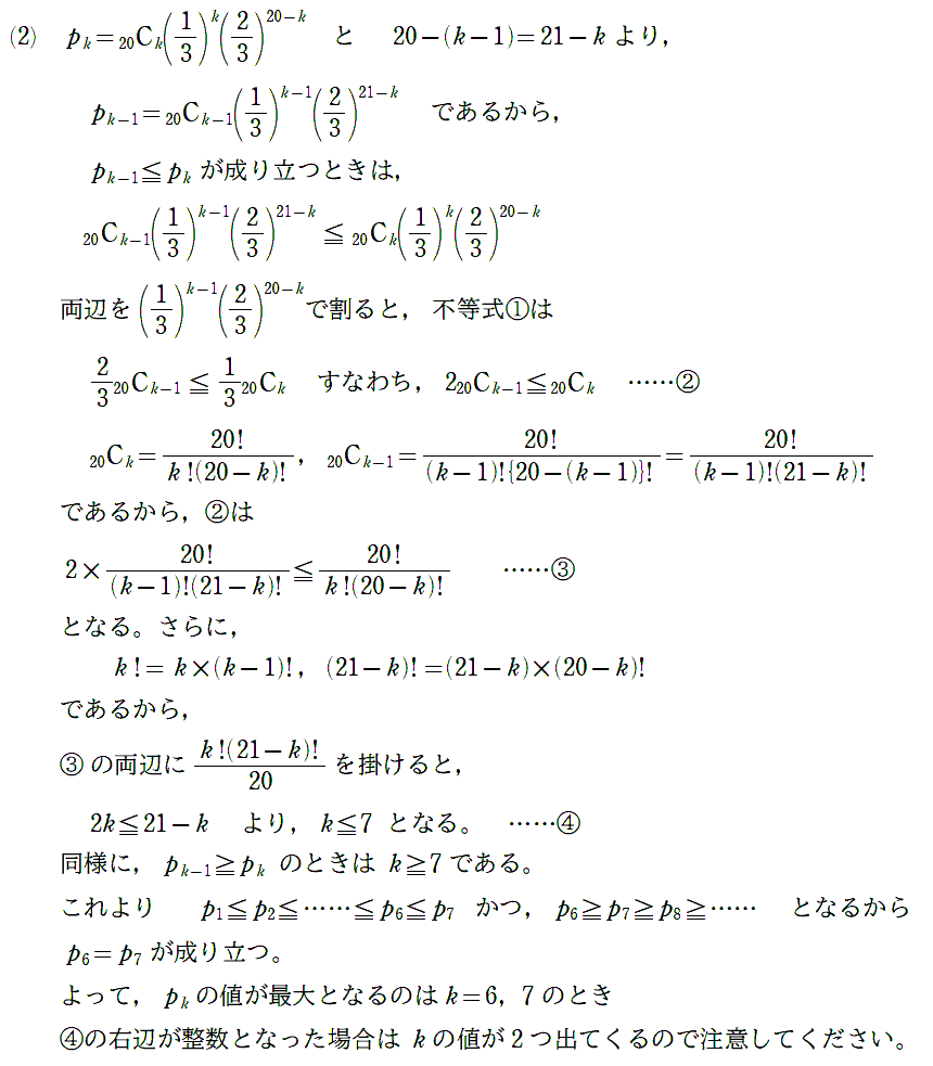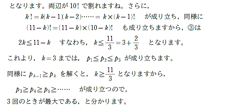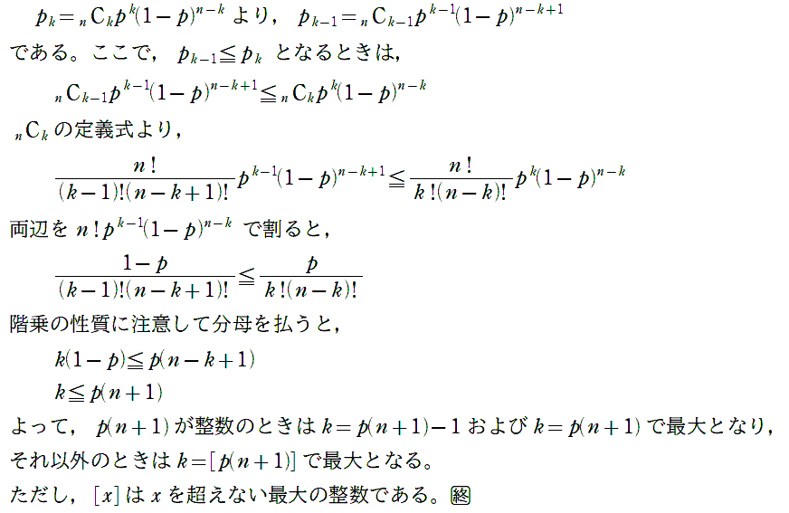 ある試行に対し,事象 k の起こる確率を pk とする。 p1 < p2 <・・・< pk - 1 < pk かつ,pk > pk+1 >・・・ が成り立つとき,pk が求める最大値である。 |