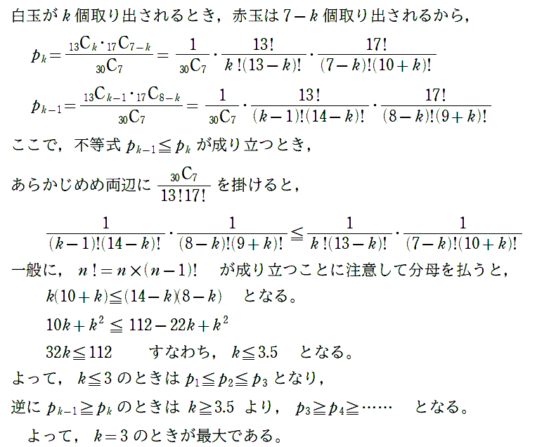 白玉 13 個,赤玉 17 個の入った袋から 7 個を同時に取り出すとき,白玉が k 個取り出される確率を pk とする。 pk の値が最大になるときの k の値を求めよ。 |