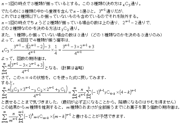 これが原文で、期待値でなく、「n回目で揃う確率」とした問題はこちらで扱いました。