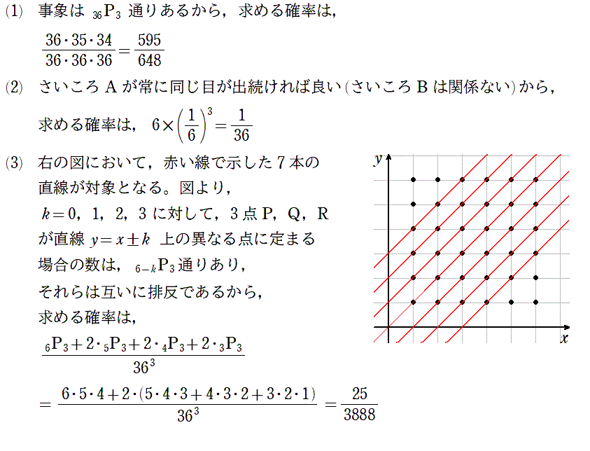 P,Q,R が互いに異なり,かつ傾きが 1 の直線上にある確率を求めよ。